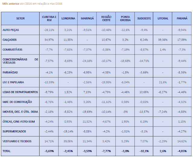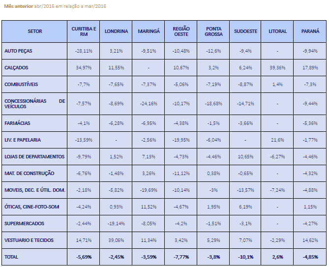 Na variação mensal (abril em relação a março), exceto pelo Litoral, que teve crescimento de 2,6%, todas as regiões tiveram queda nas vendas: Sudoeste (-10,1%), Oeste (-7,77%), Curitiba e Região Metropolitana (-5,69%), Ponta Grossa (3,8%), Maringá (-3,59%) e Londrina (-2,45%).