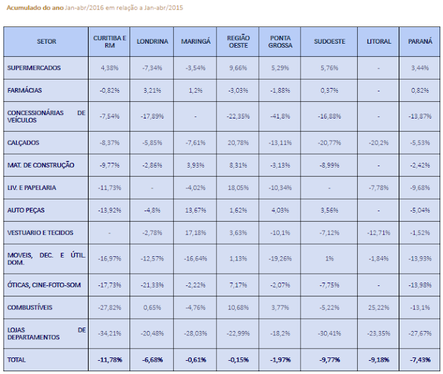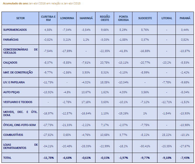 Já na análise interanual (abril/2016 em relação a abril/2015), novamente o Sudoeste figura com o pior desempenho, com baixa de 9,82%, seguido por Curitiba (-7,72%), região Oeste (-3,75%) e Ponta Grossa (-1,6%). As regiões com faturamento positivo foram Maringá (3,58%), Londrina (1,14%) e o Litoral (1,04%).