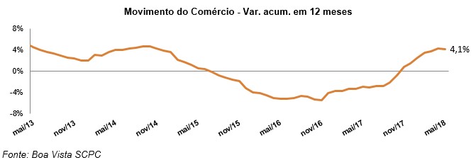 O movimento do comércio varejista caiu 2%, em maio, de acordo com os dados da comparação com o mesmo período do ano passado, apurados pela Boa Vista SCPC. No acumulado em 12 meses, o indicador avançou 4,1% (junho de 2017 até maio de 2018 frente ao mesmo período do ano anterior). Na avaliação mensal, a queda foi de 0,8%.