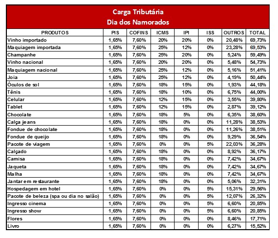 Maquiagem importada (69,5%) e nacional (51,4%) e joia (50,4%) figuram entres os presentes mais tributados do levantamento, além do tradicional champanhe (59,4%) para brindar. Item desejado pelos românticos, as flores têm a segunda menor tributação, com 17,1%. Outros produtos da lista são malha, camisa e jaqueta (34,6%), bota (36,1%), calça jeans (38,5%), tênis (44%) e óculos de sol (44,1%). Apostar em uma viagem romântica significa pagar 36,2% em tributos, sendo que só a hospedagem em hotel tem carga de 29,5%.